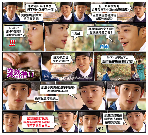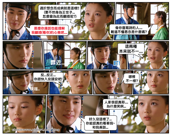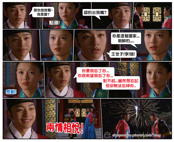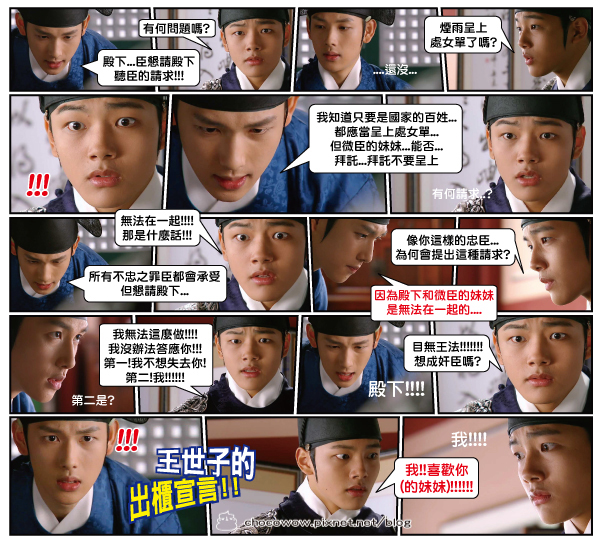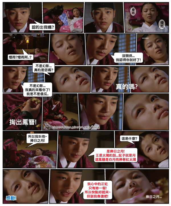 世子雖然尚未掌權但也不是省油的燈,馬上私下動員成均館的儒生帶頭抗議黑箱作業,終於逼著主辦單位必須公平公正公開的挑選王妃,而煙雨因其聰穎過人在機智問答的部分拿下高分,最後過關斬將摘下后冠。(哈哈這過程簡直就是選美大賽!!只是沒有演佳麗間的勾心鬥角真可惜XDDD)世子得知煙雨終於成為他的嬪妃非常高興,在煙雨入宮的那一晚還特地用心準備了浪漫的驚喜,但這段他們演的越是幸福我們看的越是心痛。