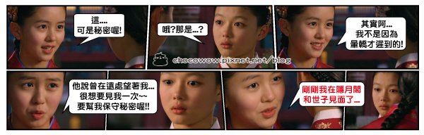 這時小煙雨和世子兩人除了信件傳情外並沒有見過面表達心意(真是有夠純情啊),所以寶鏡這招讓原本期待世子的煙雨失落了一下子,但就真的只有一下子,因為在祈福晚會當天世子不顧皇上反對偷偷密會了煙雨,兩人確定了彼此的心意,女二和男二一樣都非常沒有殺傷力XDD。這次秘會世子也告訴煙雨,接下來會發佈挑王妃的比賽公告,表示自己會相信並等待煙雨,打敗各家競爭好手到他的身邊。