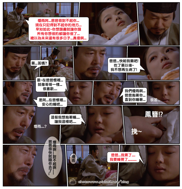 而擁抱太陽的月亮會這麼紅,當然也不只男女主角會演會哭,煙雨和家人的生死離別也是催淚彈(最無法抵擋親情戲了),煙雨父親為了讓自己女兒不再痛苦而提早了煙雨的死期,親手喂了女兒(他以為是的)死藥,雖然我沒當過父母也能體會一個如此疼愛女兒的父親,必須做出這種決定心裡是何種心情!